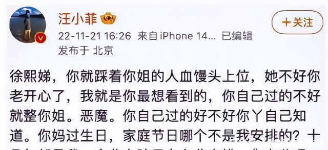 在节目里小两人更是经常不顾姐妹情谊,在大庭广众下互怼,毫不留情面。 而且大S已经去世了快一年了,她出席颁奖典礼还是会拿姐姐的离去大做文章。 这似乎印证了她前姐夫汪小菲的一段话: “徐熙娣是踩着徐熙媛的人血馒头上位的人”。